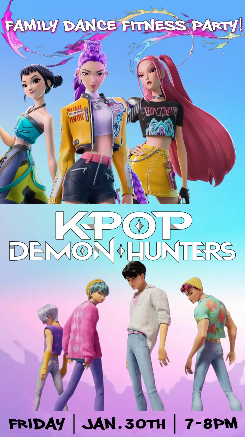 π₯πΆ Get ready to dance, battle, and save the night at our K-Pop Demon Hunters Family Dance Fitness Party on Friday, January 30th from 7β8pm!